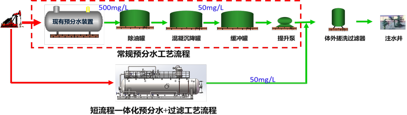 实施预分水,在井口、井组、计量站或者接转站提前把大部分采出水分离出来并就地处理达标后回注,剩余低含水油再送至联合站集中处理,可简化工艺、节约投资、降低能耗和运行成本,并避免联合站大规模扩建。